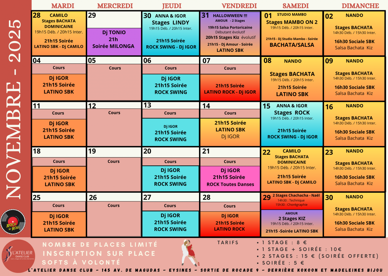 - Samedi 19h15 20h15 : Stages Latinos et Rock ( 19h Débutant, 20h Intermédiaire )